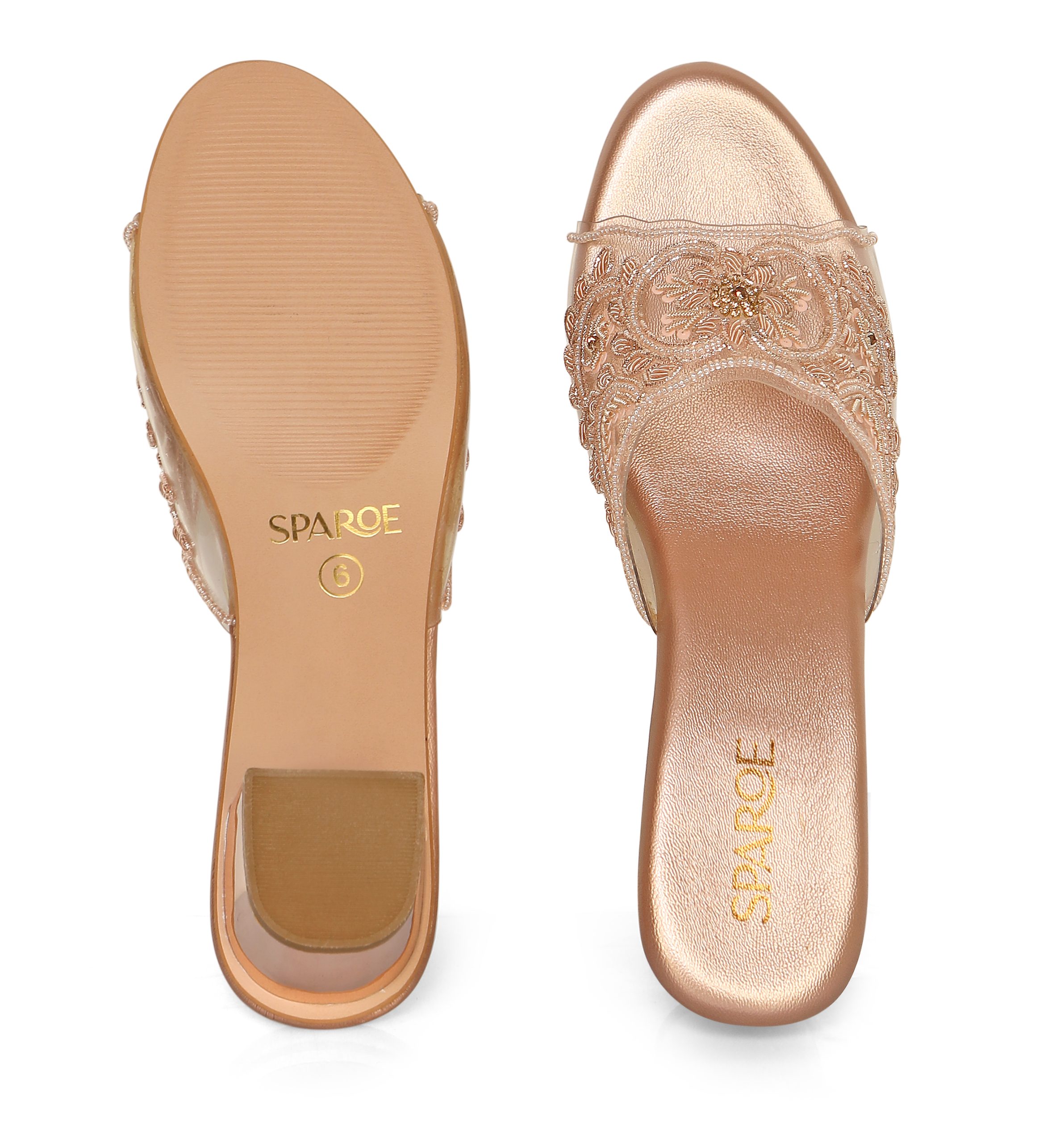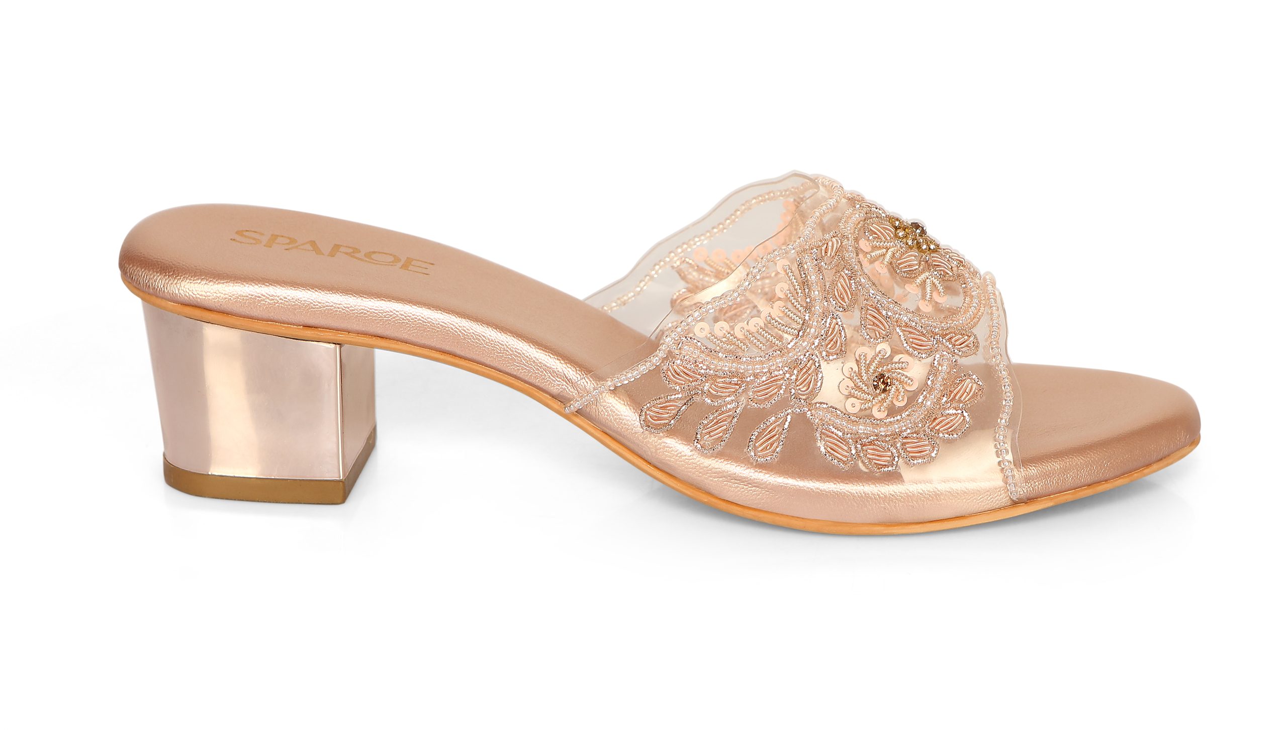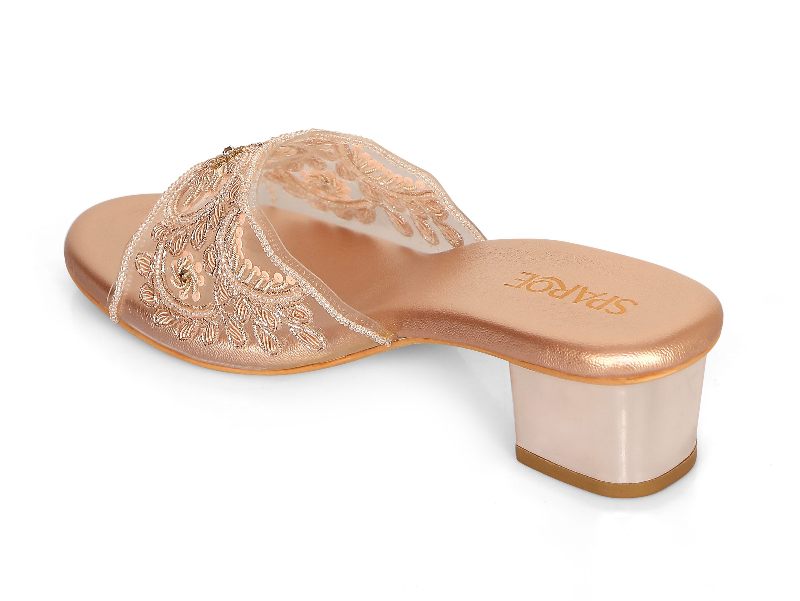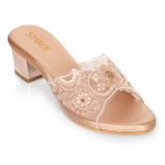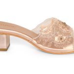 Elegant embroidered block heel slip-ons with transparent mesh strap and metallic finish. Available in Black ,Gold and Rose Gold. Perfect for weddings, parties & festive occasions.