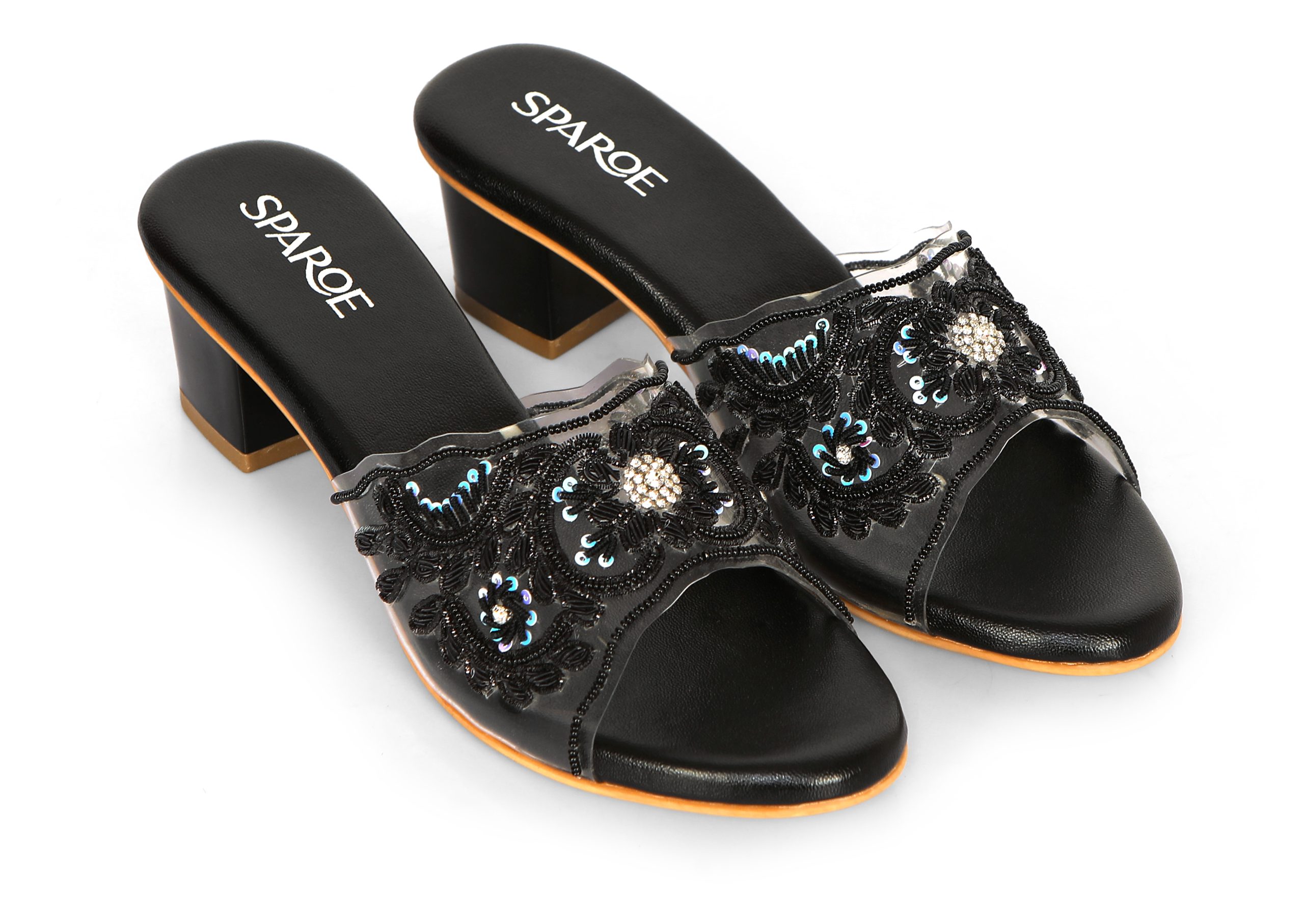 Sparoe Embroidered Block Heel Slip-On Sandals – Black