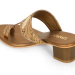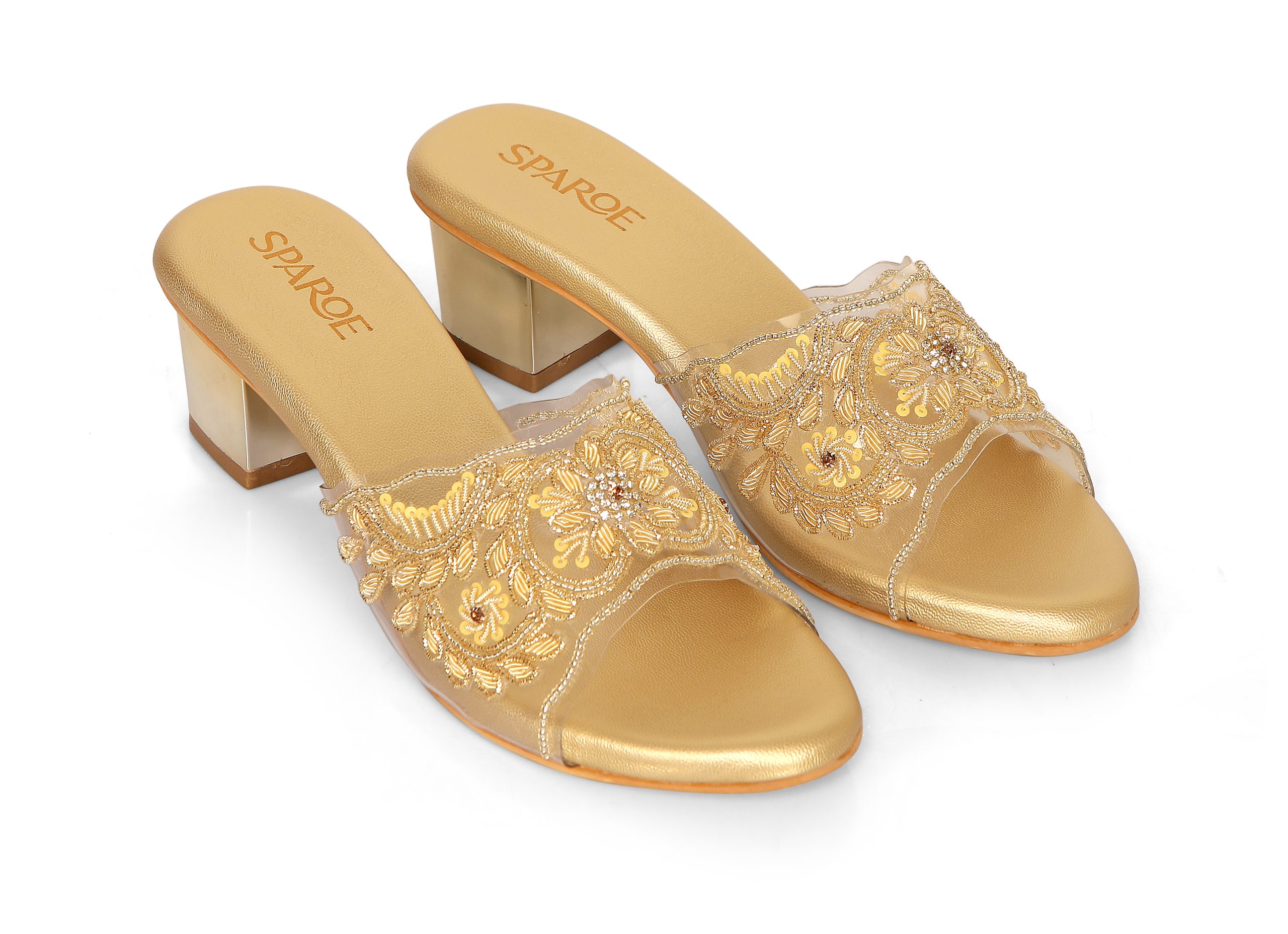 SPAROE Women’s Gold Embellished Heeled Sandals | Festive Wear Slip-On | Cushioned Comfort | Ethnic Party Footwear