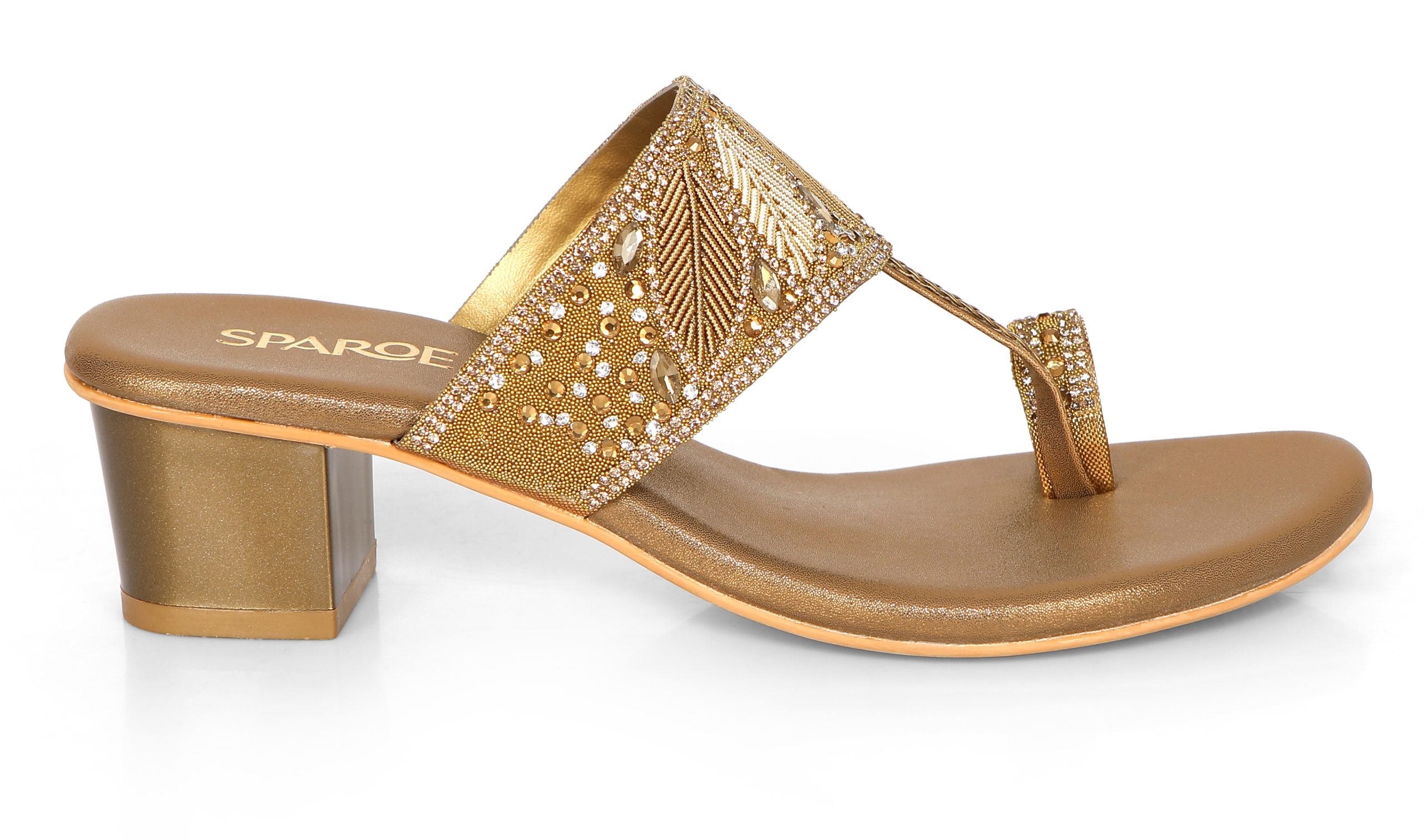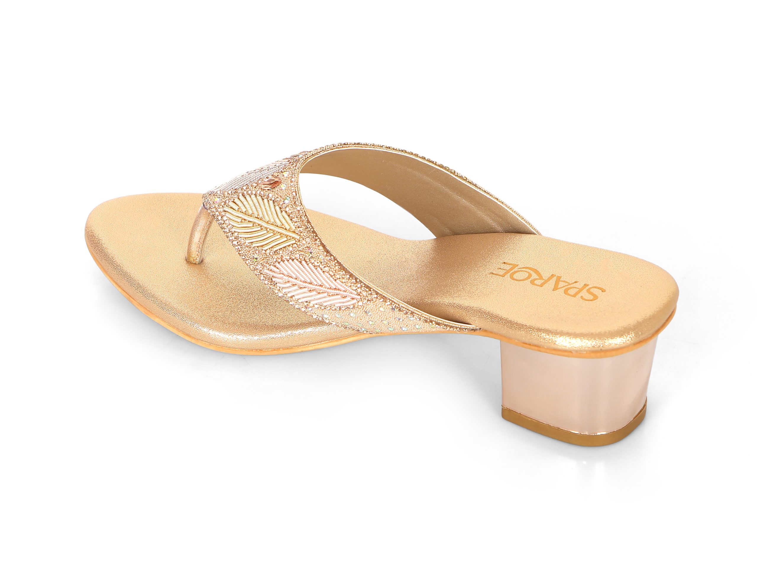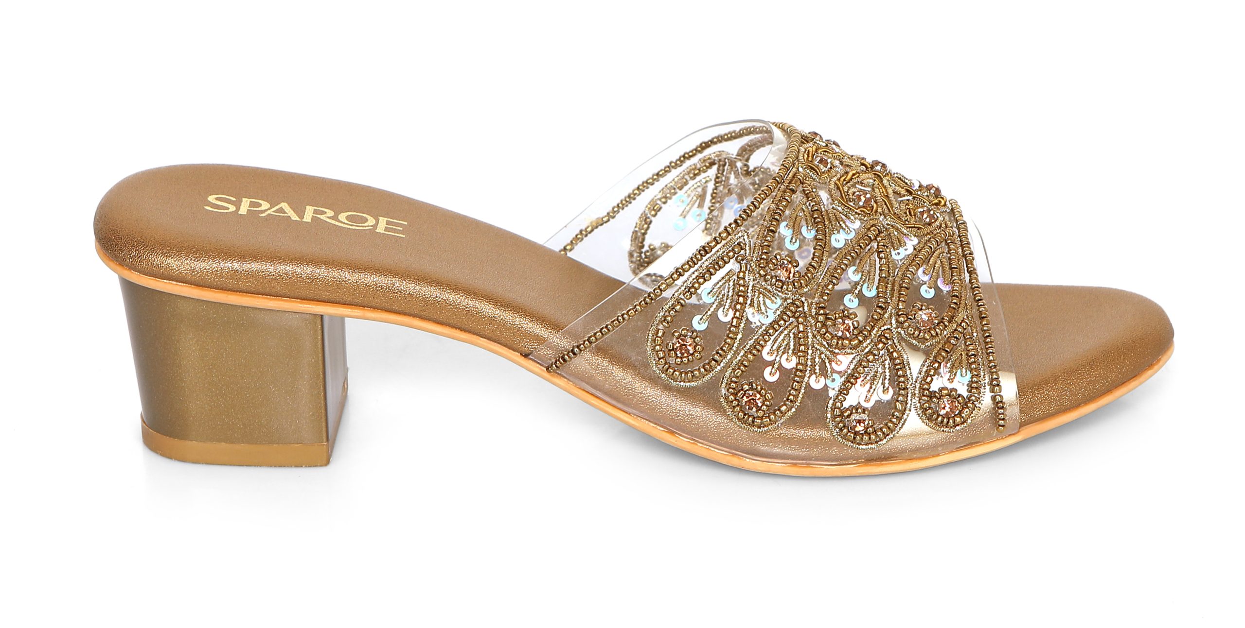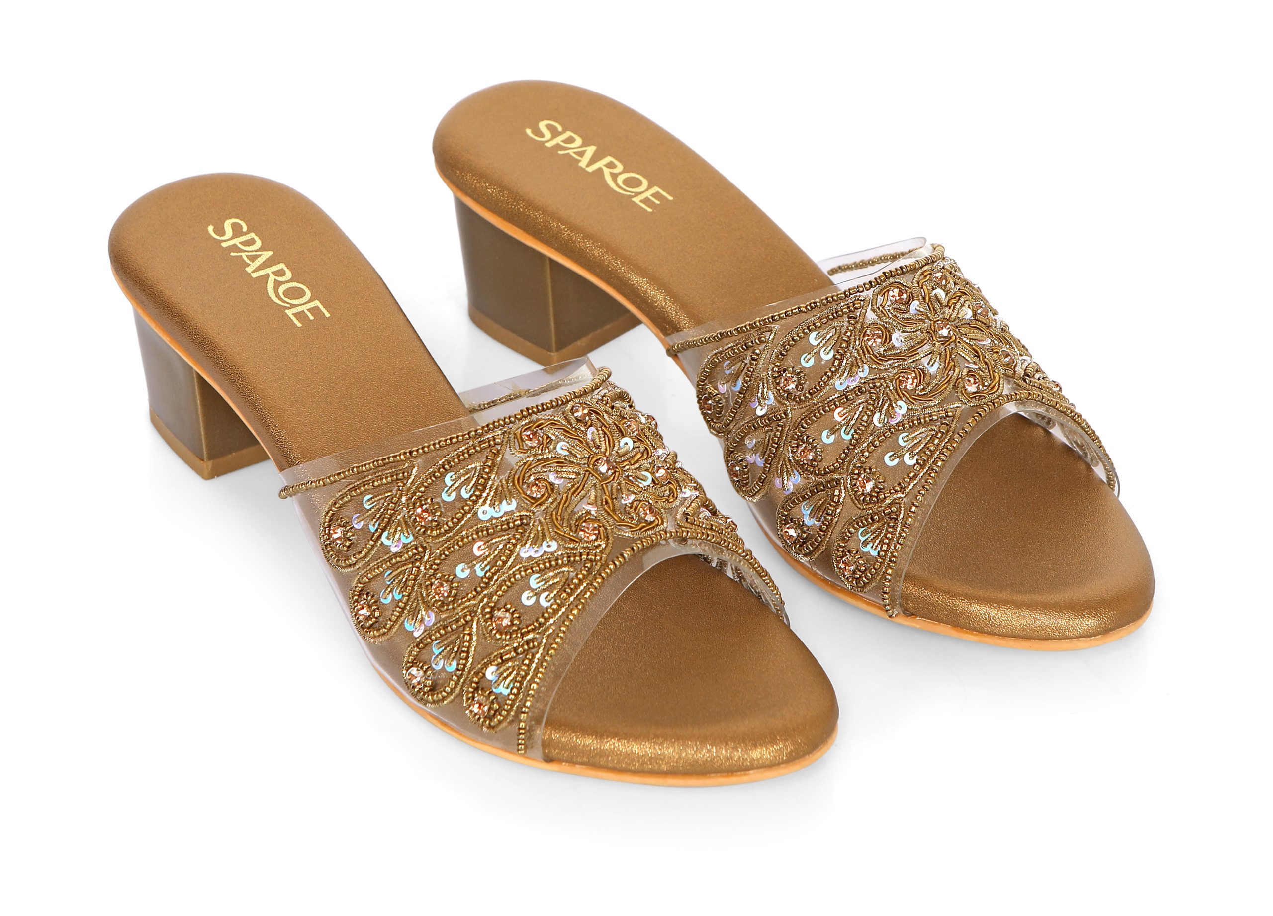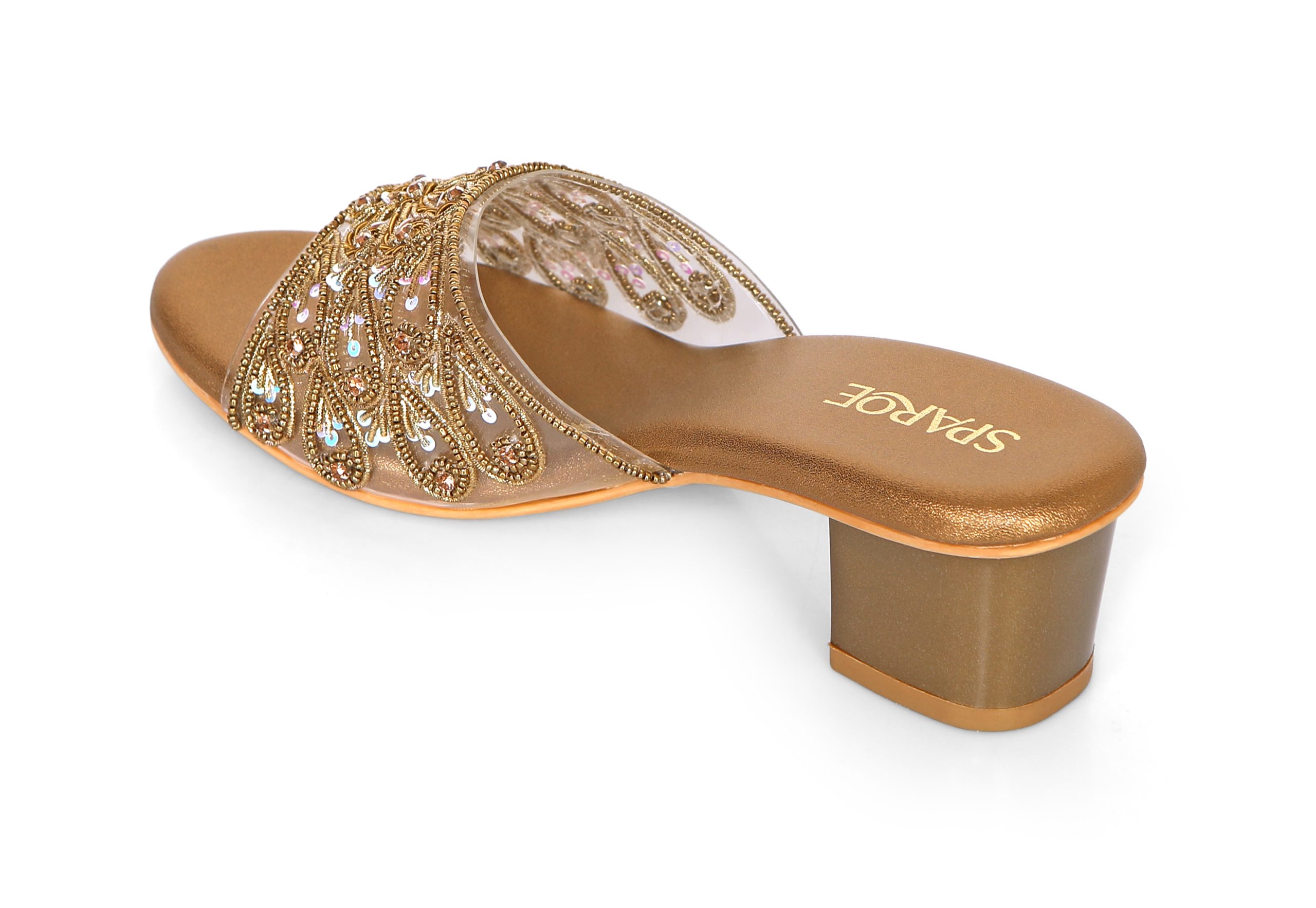 SPAROE Women’s Gold Embellished Heeled Sandals | Festive Wear Slip-On | Cushioned Comfort | Ethnic Party Footwear