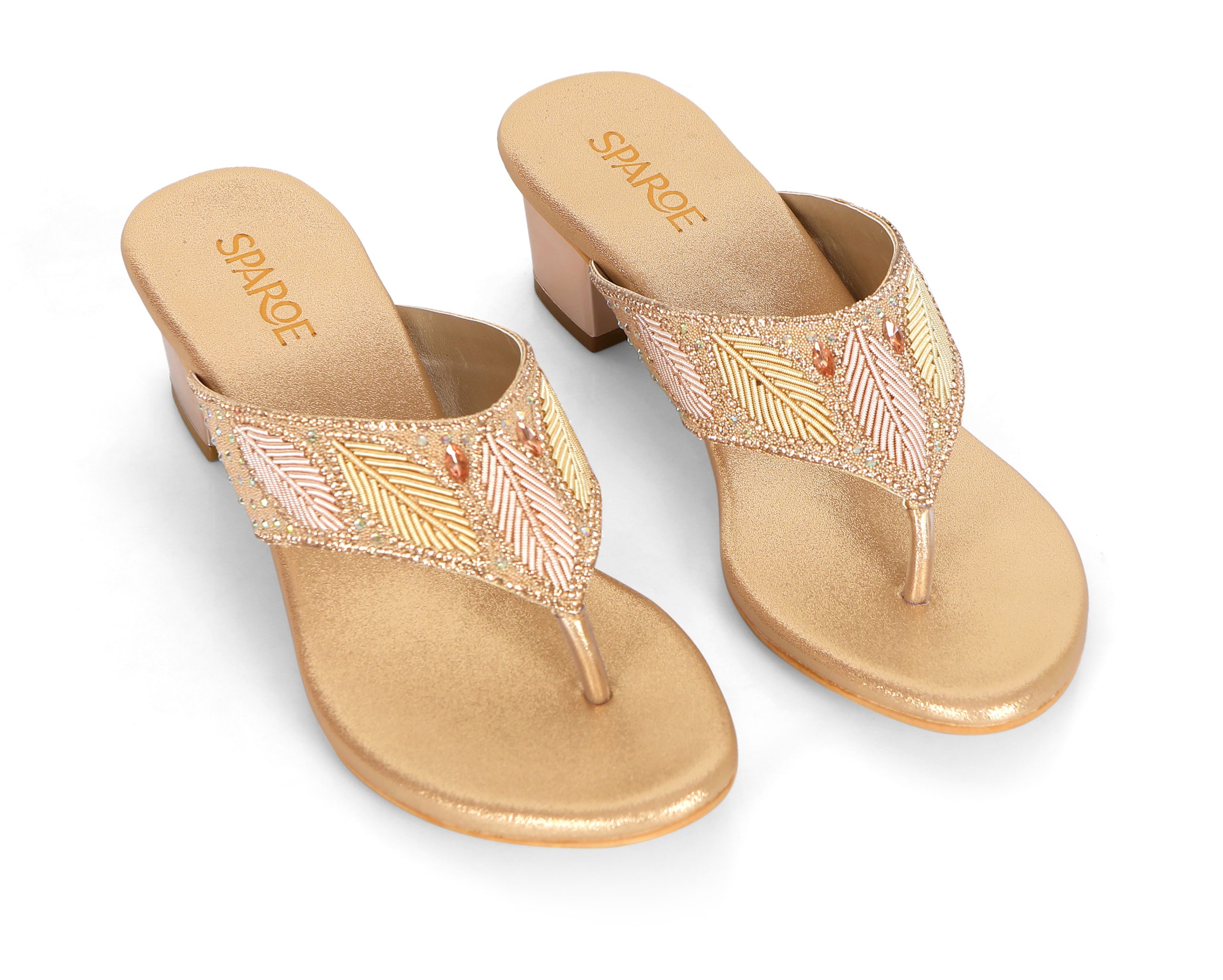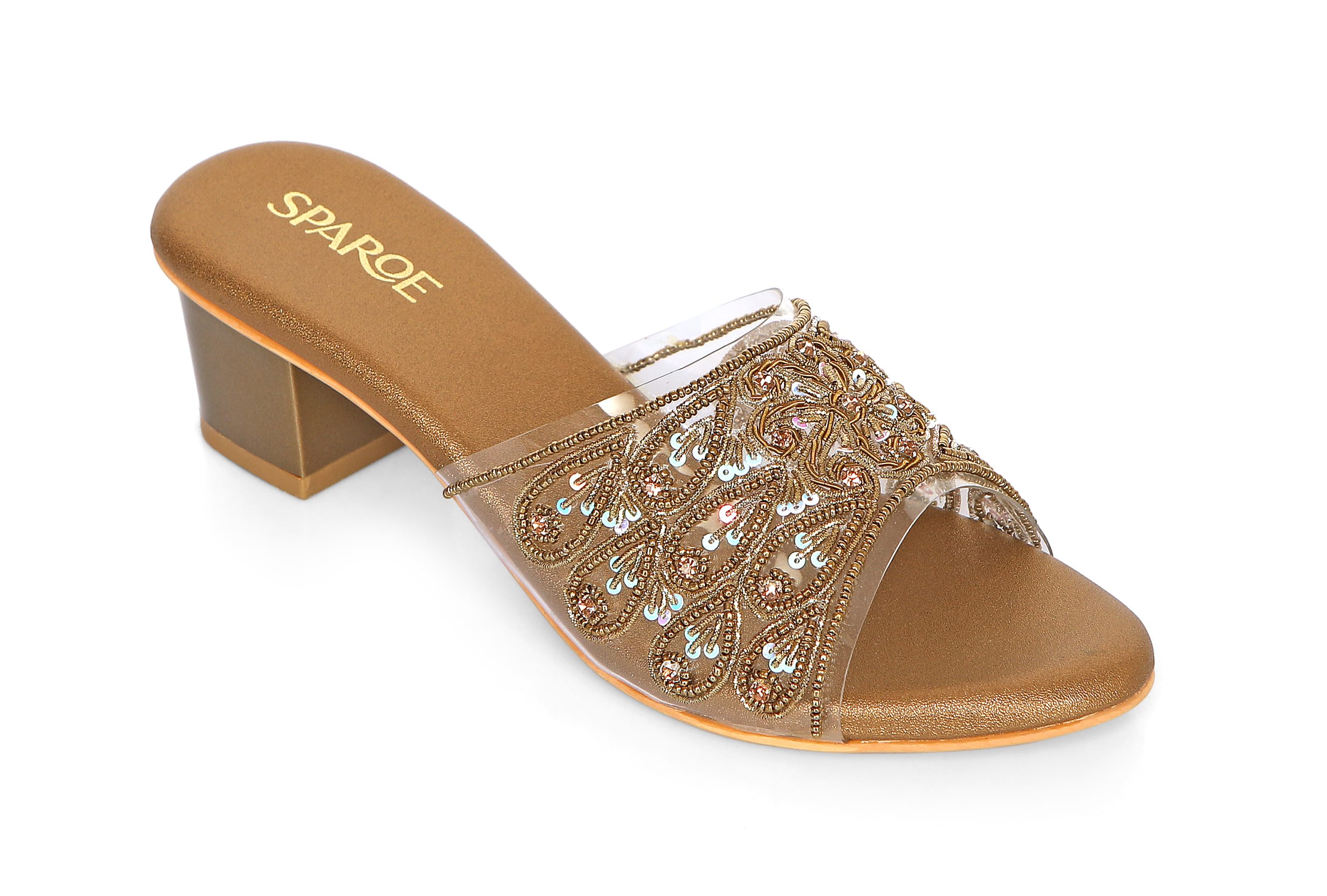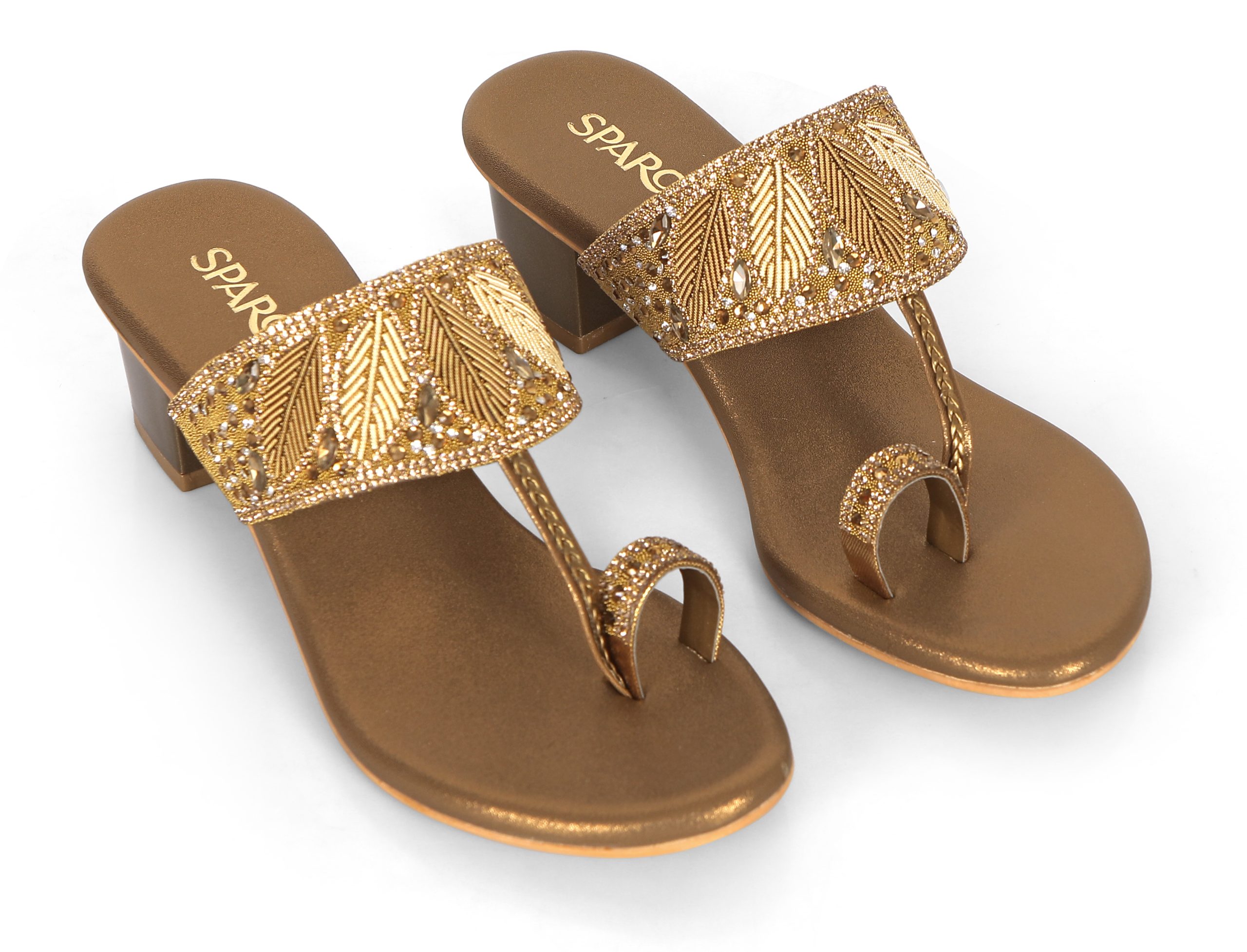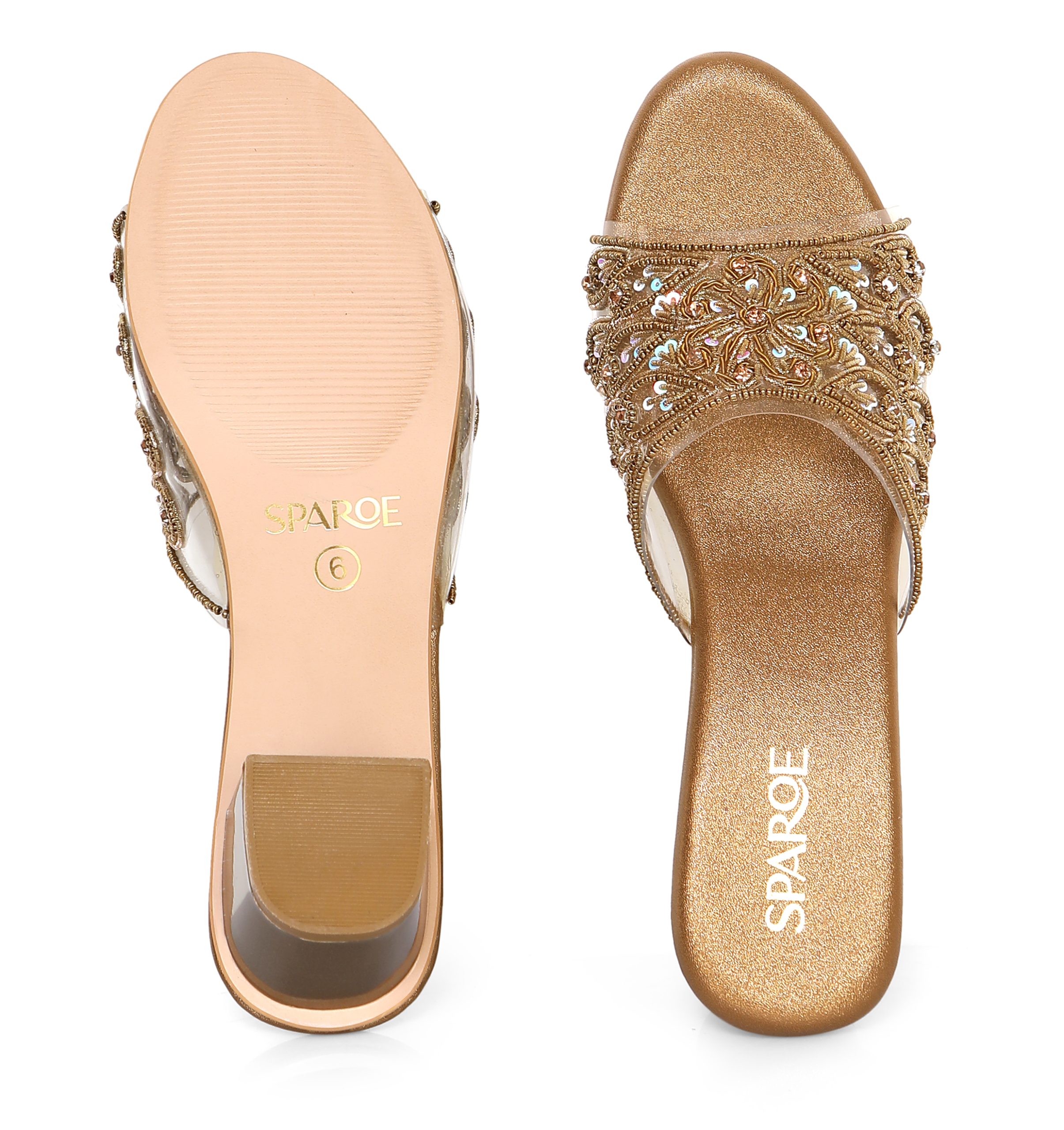 SPAROE Women’s Gold Embellished Heeled Sandals | Festive Wear Slip-On | Cushioned Comfort | Ethnic Party Footwear