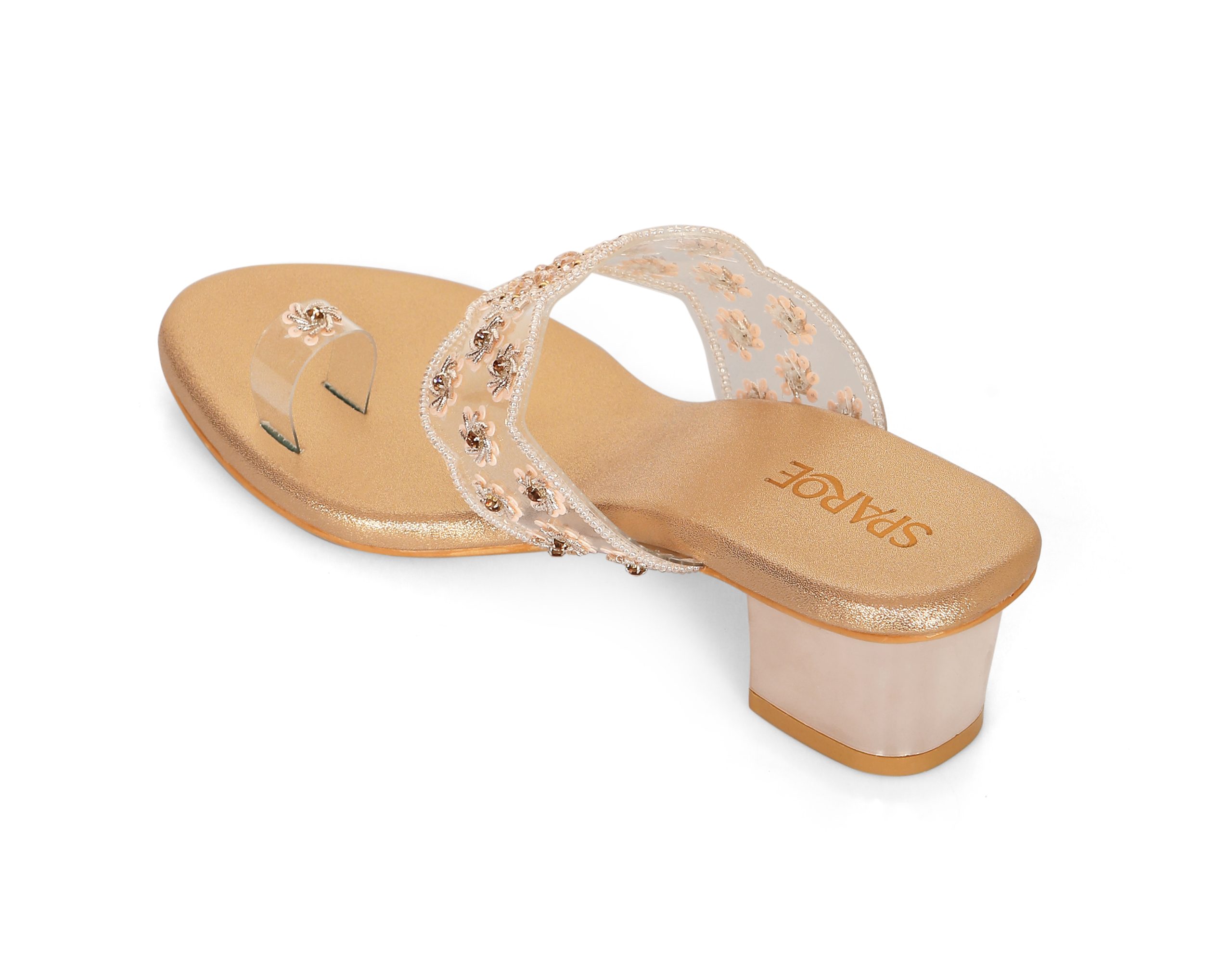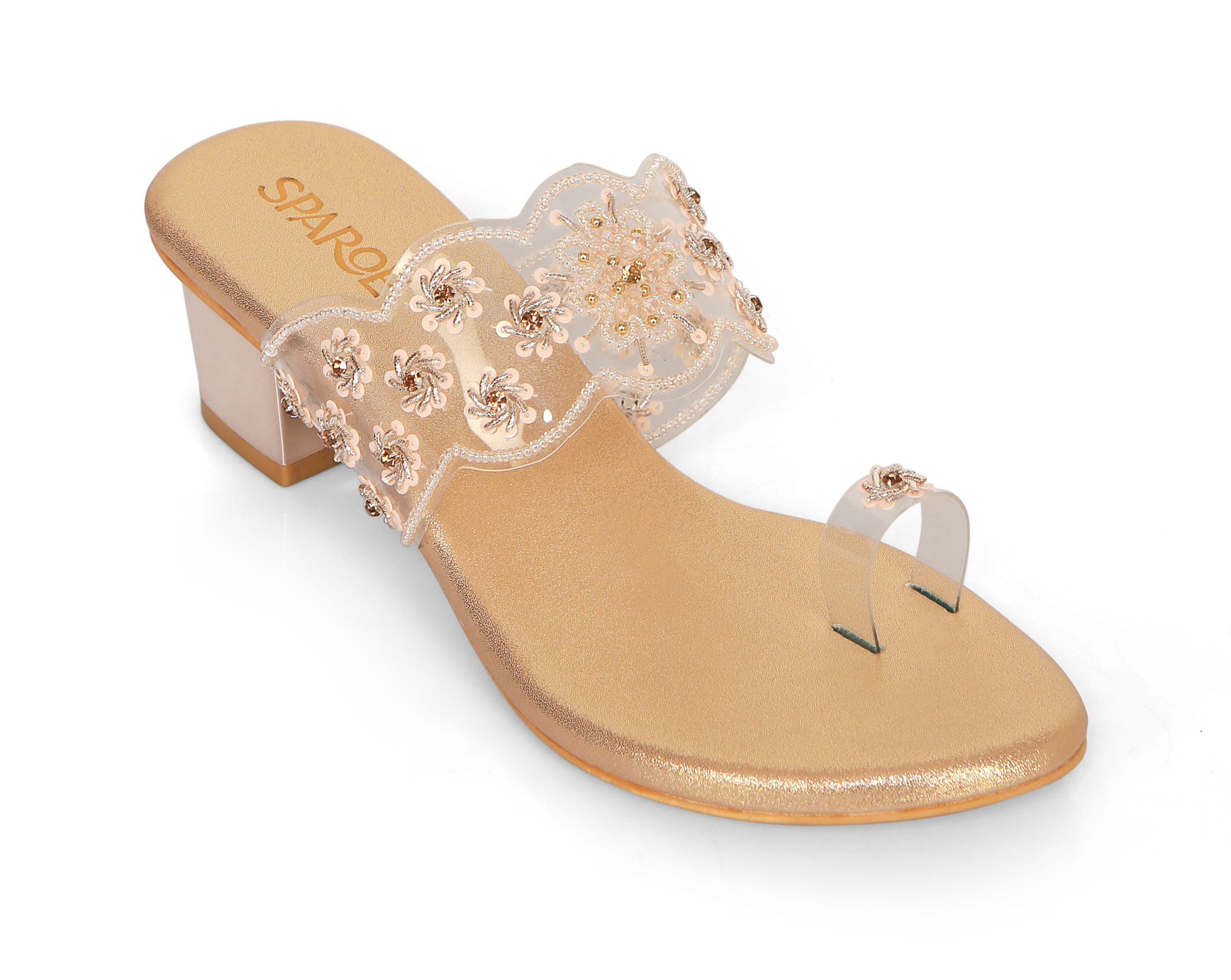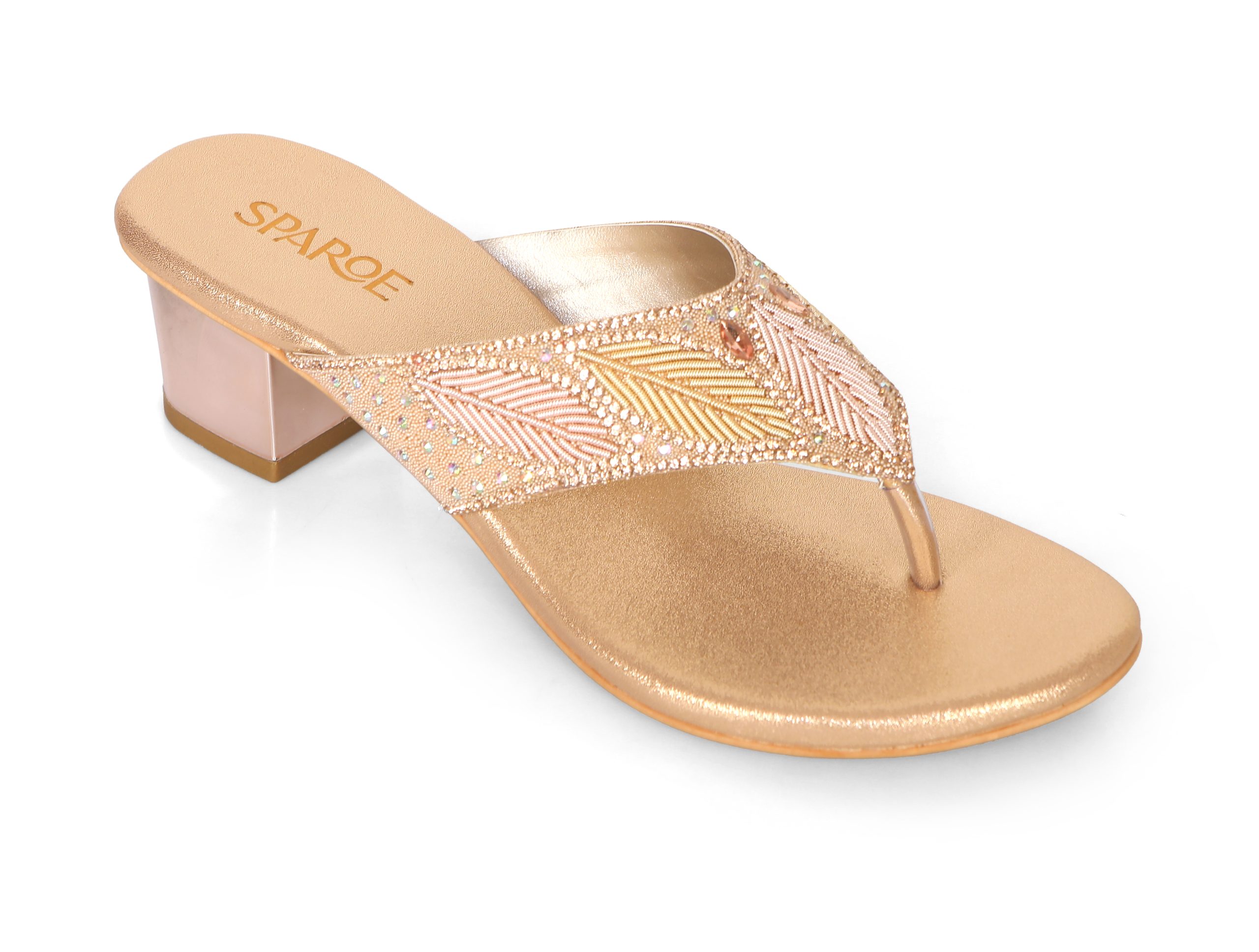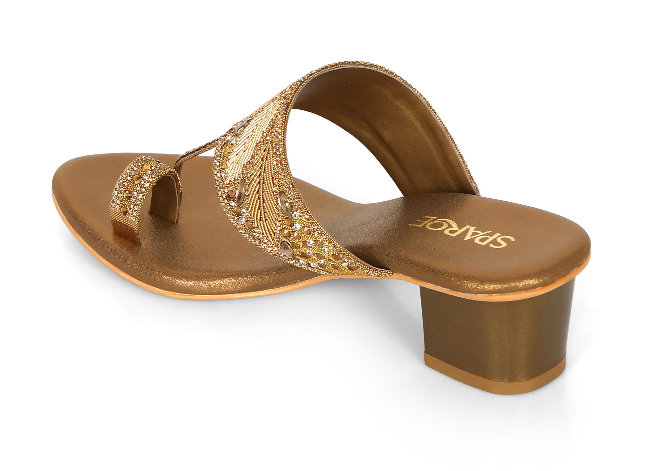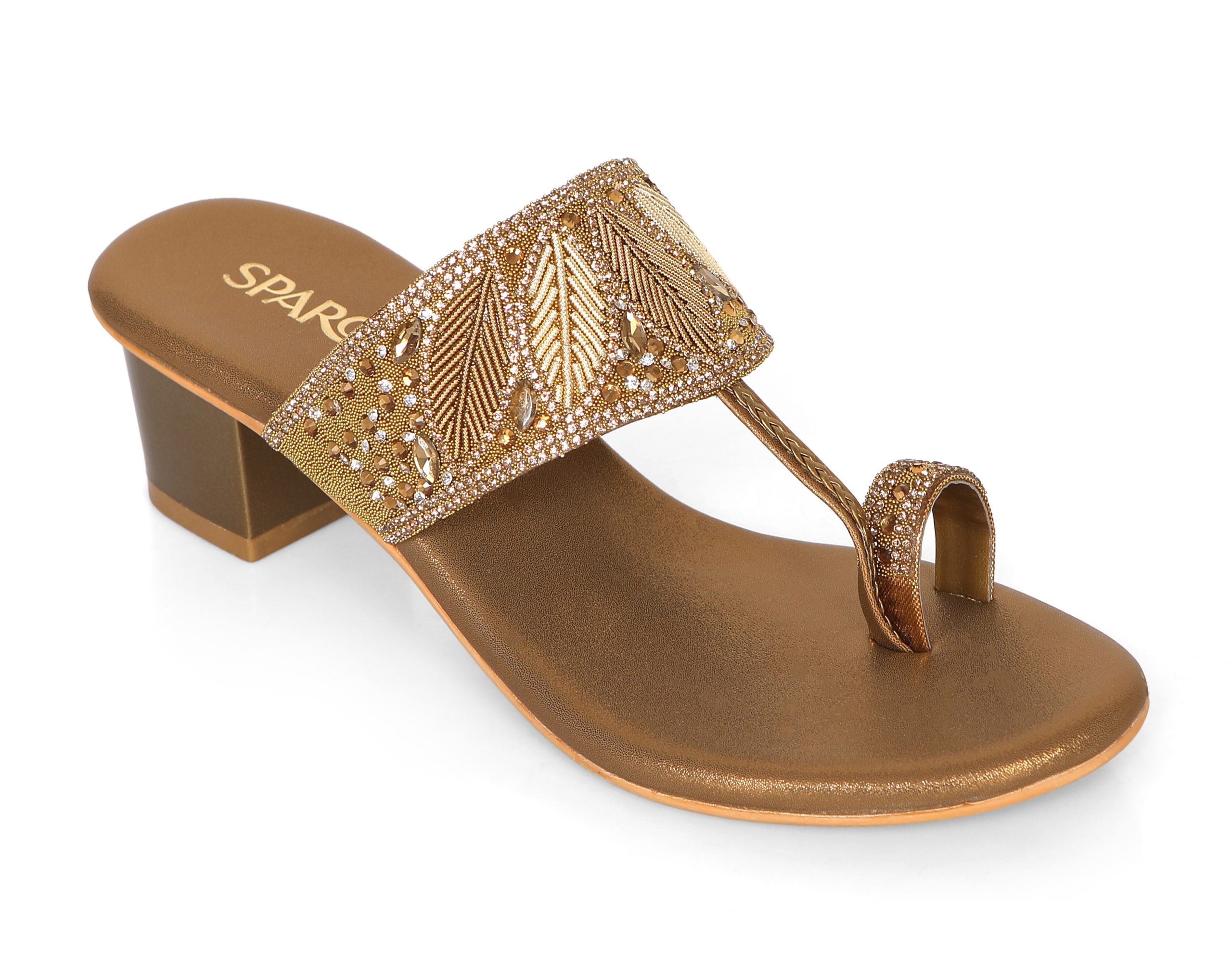 SPAROE Women’s Gold Embellished Heeled Sandals | Festive Wear Slip-On | Cushioned Comfort | Ethnic Party Footwear