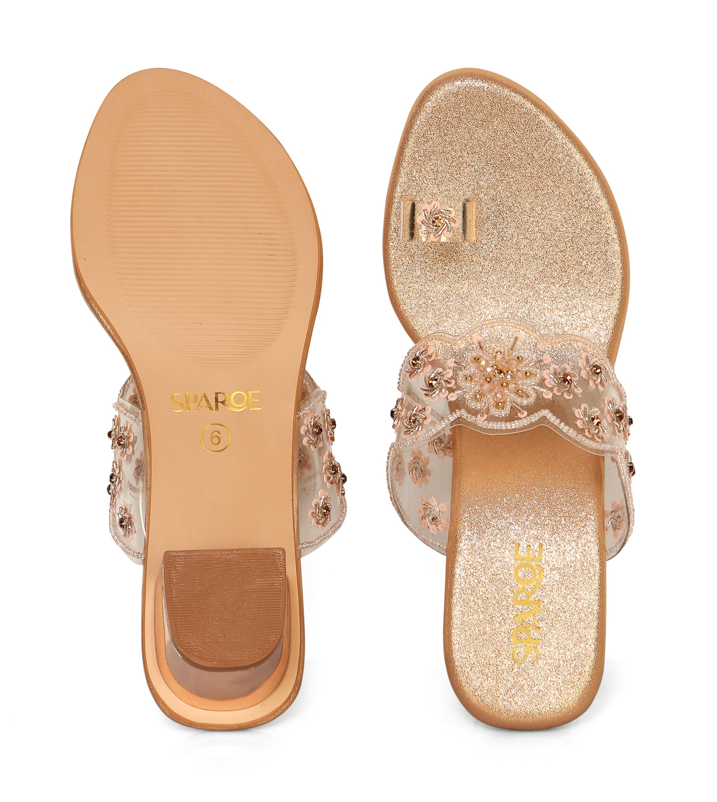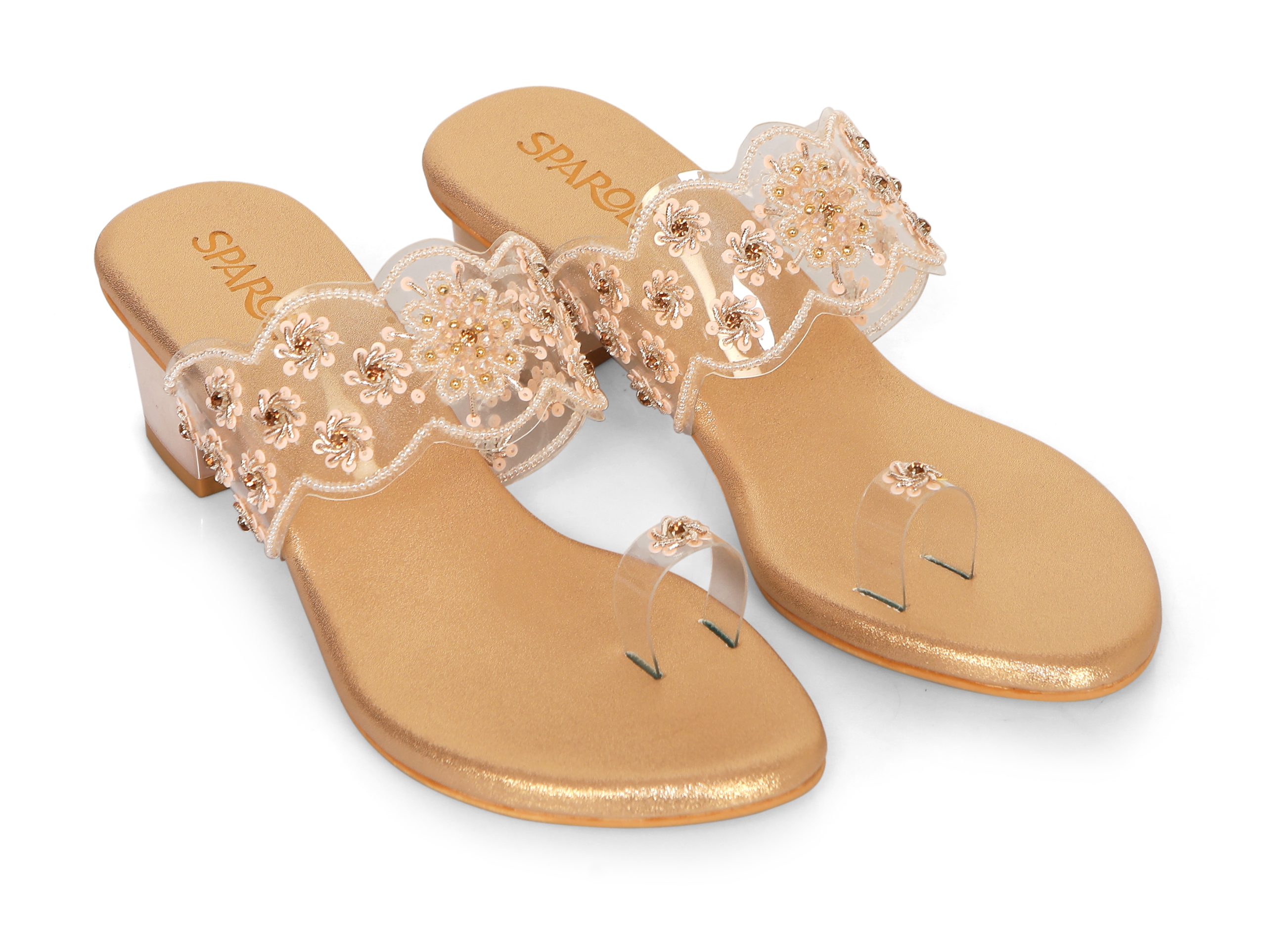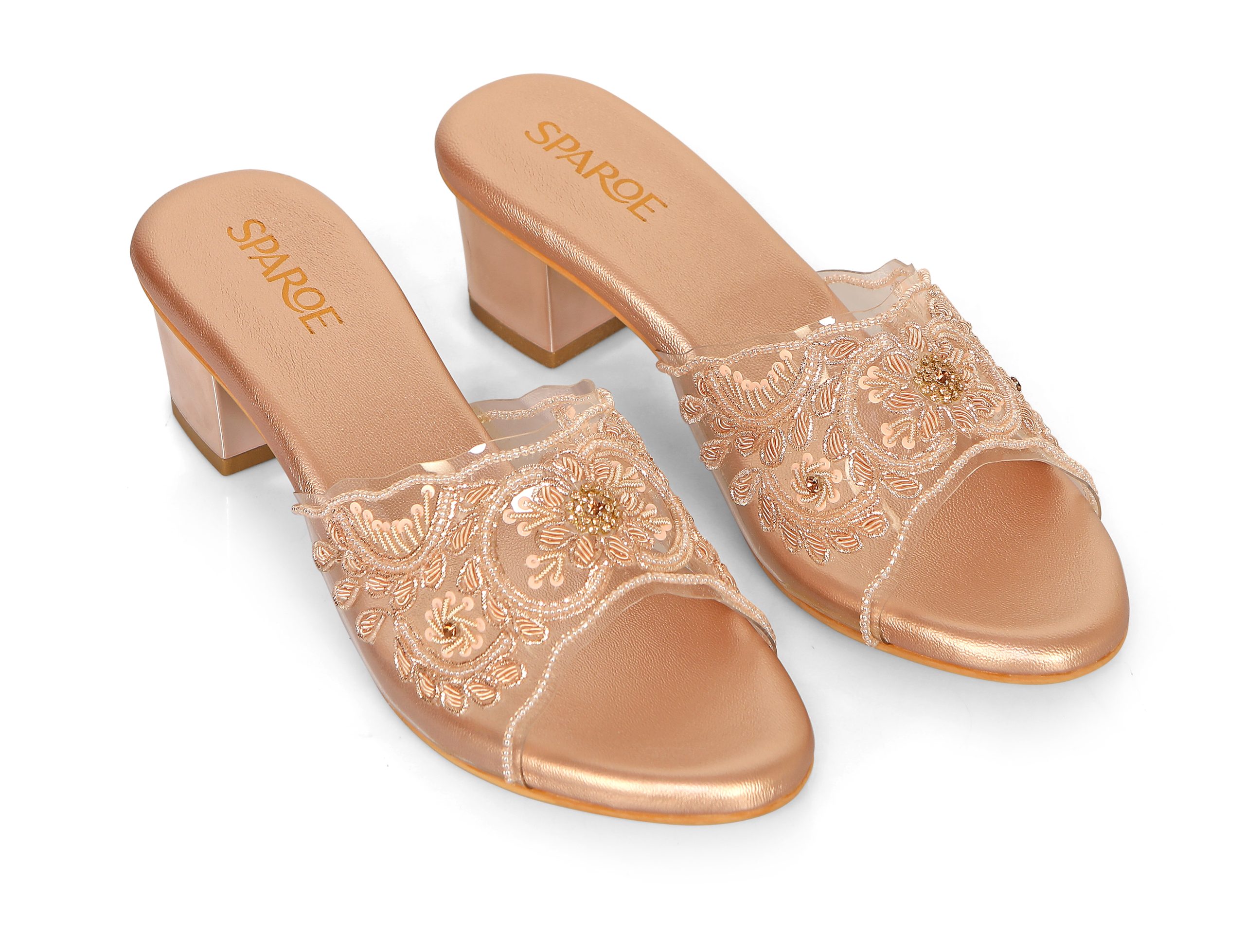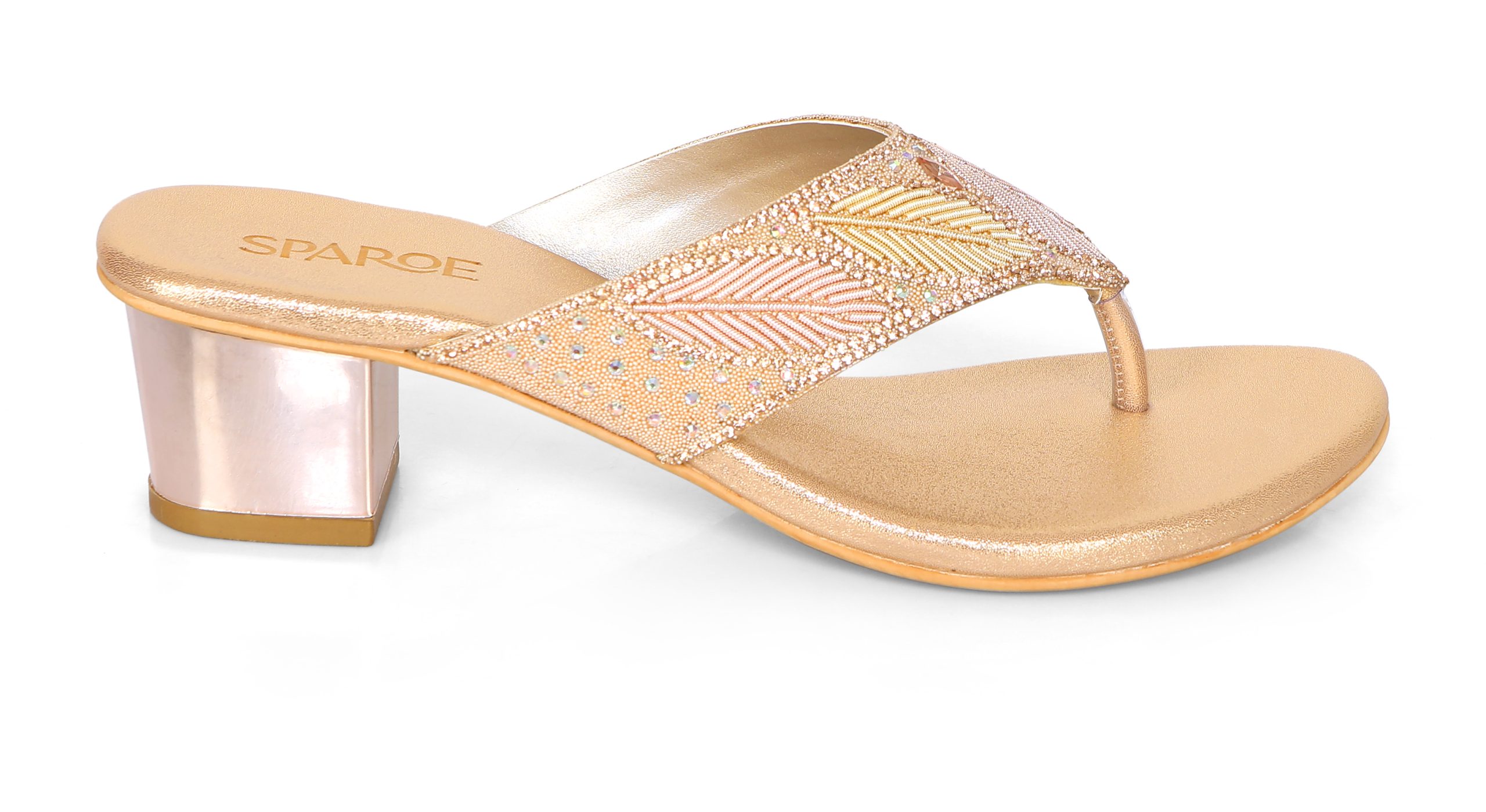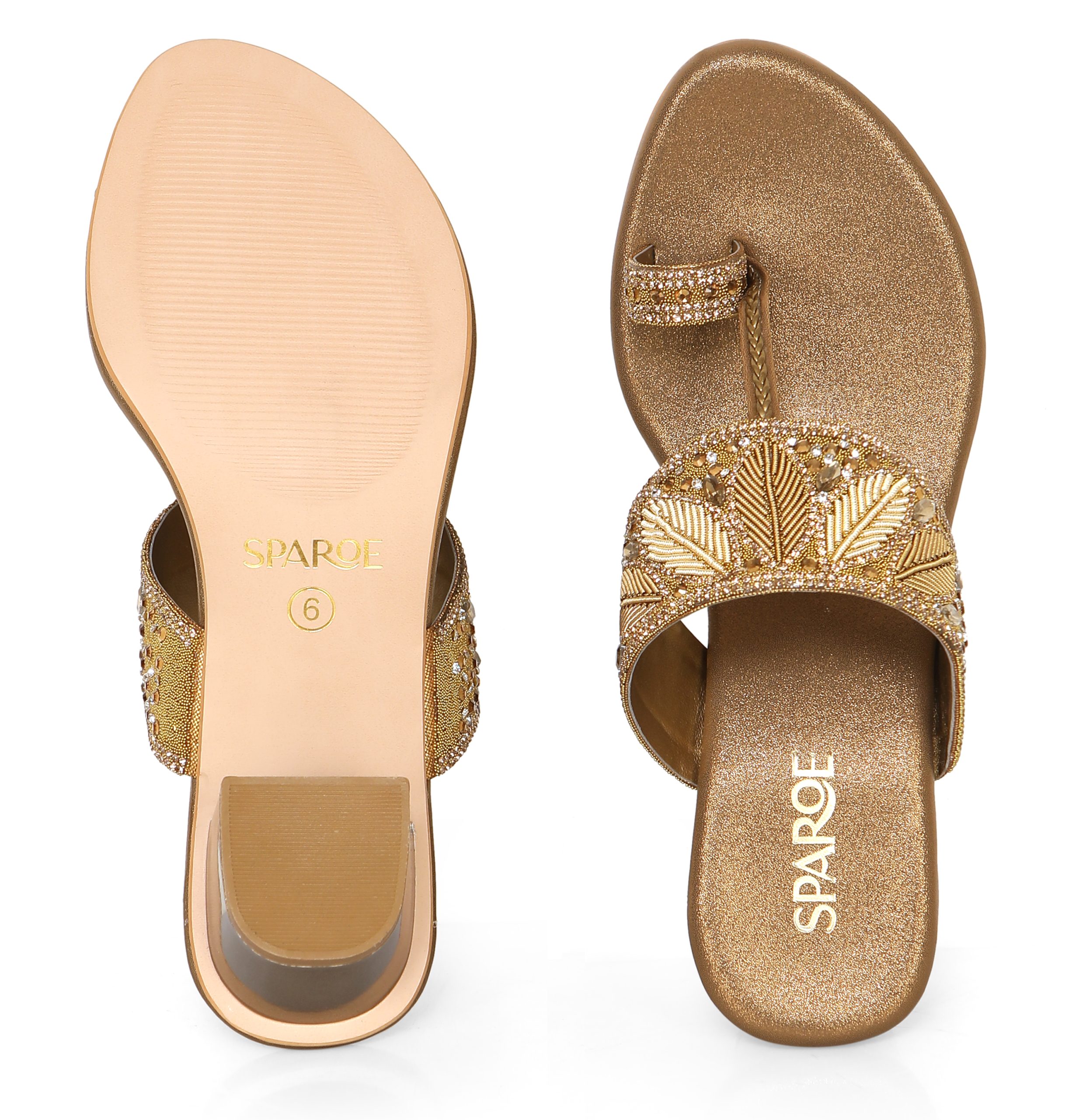 SPAROE Women’s Gold Embellished Heeled Sandals | Festive Wear Slip-On | Cushioned Comfort | Ethnic Party Footwear